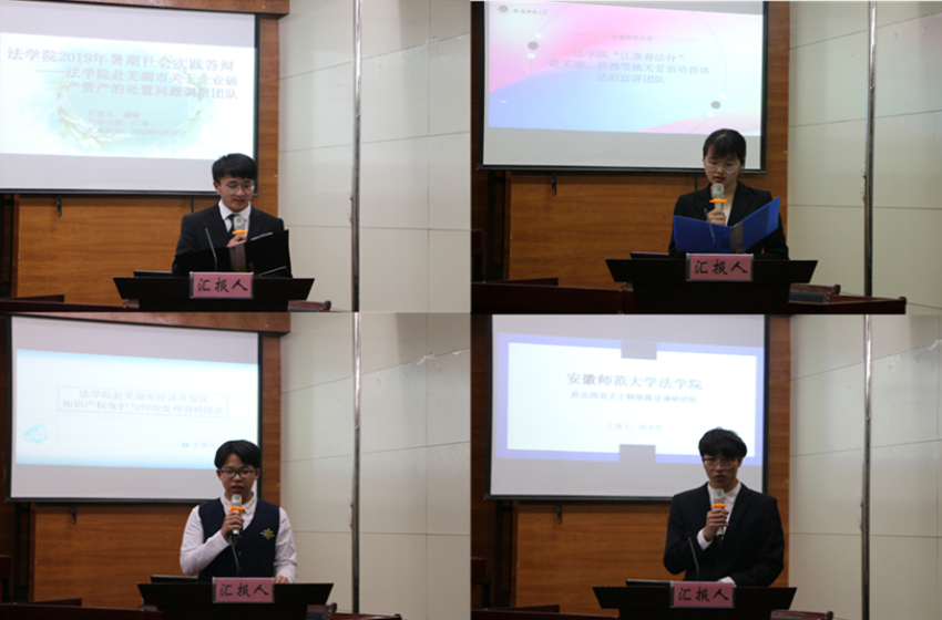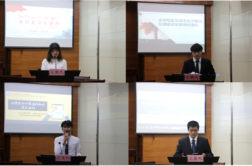 此次答辩会共有20支队伍参加,分为汇报和答辩两个环节。各队代表根据实践选题进行时长不超过三分钟的汇报。他们结合PPT,围绕活动背景与目的、前期准备、活动方案、团队成员、经费预算、应急预案等方面详细阐述。20支队伍社会实践选题多样,涉及知识产权保护、社区矫正现状、法律风险防范、互联网+与司法改革等方面。在答辩环节,评审老师从团队课题选择、活动方案、住宿和安全等方面进行提问,并针对不同的团队提出具体的建议和改进方案。