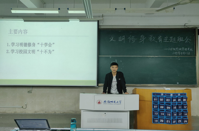 曹东松首先介绍了此次班会的背景,每年的四月是我校的“文明修身月”,通过仔细讲解学校文明的“十学会”和“十不为”,告诉了同学们哪些该做哪些不该做。之后他又向同学们一条一条的解释我校的文明公约,寝室文明公约和班级文明公约,规范了同学们的行为举止,希望同学们一起为成为文明修身,文明行事的文明大学生而努力。最后辅导员冯晟对本次班会做总结,要将文明修身内化为个人品格的精神基石,外化成日常行为习惯的基本准则,做有道德,有品行的新时代大学生。
